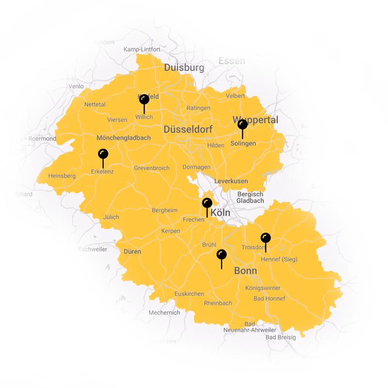 Mit über 80 Mitarbeitern betreuen wir Sie gerne in einem Umkreis von 50km rund um unseren Standort in Willich. Neu dabei sind unsere Standorte in Köln, Solingen, Erkelenz, Hennef (Sieg) und bei Bonn. Als lokales Unternehmen kommen wir gerne bei Ihnen vorbei.